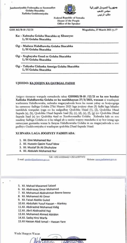 Guddoomiyaha Golaha Shacabka Baarlamaanka waqtigiisu dhamaaday ee DFS Maxamed Mursal ayaa shan kulan ka joojiyay illaa 15 xildhibaan oo lagu eedeeyay inay is hortaag ku sameeyeen fadhigii maanta ee Golaha.