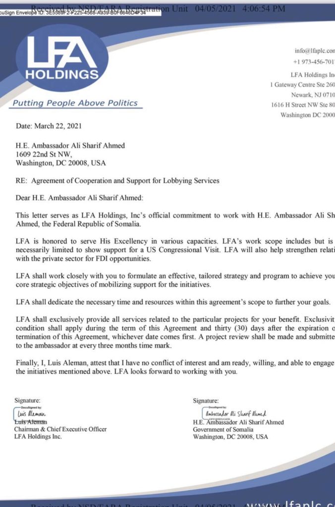 Farmaajo ayaa Lacag dhan $150,000 oo dollar kaga iibsaday shirkad loobiga samaysa oo Maraykan ah oo lagu magacaabo ‘LFA Holdings’ inay kala shaqayso sidii uu Maraykanka ku booqan lahaa, kulana kulmi lahaa Congress-ka Maraykanka.