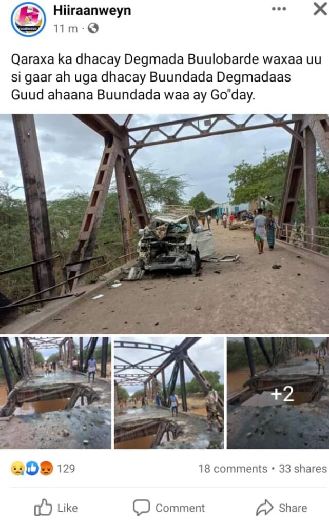 Warrarka ka imaanaya Gobolka Hiiraan ,ayaa sheegaya in Gaari waxyaabaha qarxa lagu soo rarray lagu burburiyay qayb kamid ah Buundada muhimka ah ee dul marta Webga Shabelle ee dhexmara magaalada Buulo-Burde.