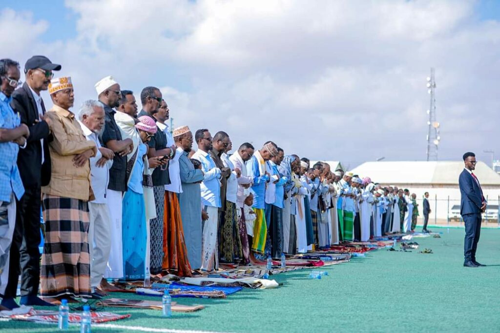 Garoowe, 10 April 2024: Ku-simaha Madaxweynaha Ahna Madaxweyne Ku-xigeenka dowladda Puntland H.E Ilyas Osman Lugatoor ayaa Garoonka Kubada Cagta ee Mira Awaare Salaada Ciidul-fitriga kula tukaday Shacabka Caasimada.