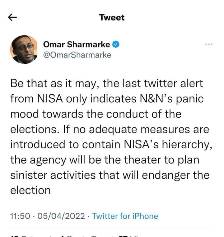 “Haddii aan la soo saarin tallaabooyin lagu xakameynayo Taliska NISA, Hey’addu waxay noqon doontaa Masrax laga soo maleego dhaq dhaqaaqyo halis ku ah Doorashooyinka,si kastaba ha ahaatee, digniintii ugu dambeysay ee Twitter-ka ee NISA waxay muujineysaa argagaxa N&N ee ku aaddan qabsoomida doorashada”