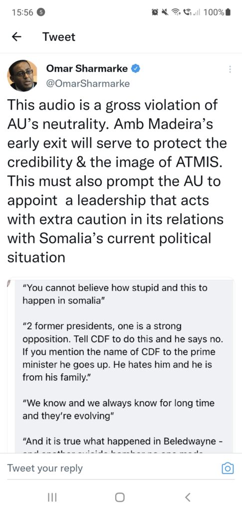“Codkaani waa xad gudub weyn oo ka dhan ah dhexdhexaadnimada AU. Cayrinta Danjire. Madeira waxay u adeegi doontaa si loo ilaaliyo kalsoonida & sawirka ATMIS. Tani waa inay sidoo kale soo dedejiso AU inay soo magacawdo hoggaan si taxadar leh u dhaqma xiriirka uu la leeyahay xaaladda siyaasadeed ee Somaliya ee hadda”Ayuu yiri Cumar Csbdirashiid.