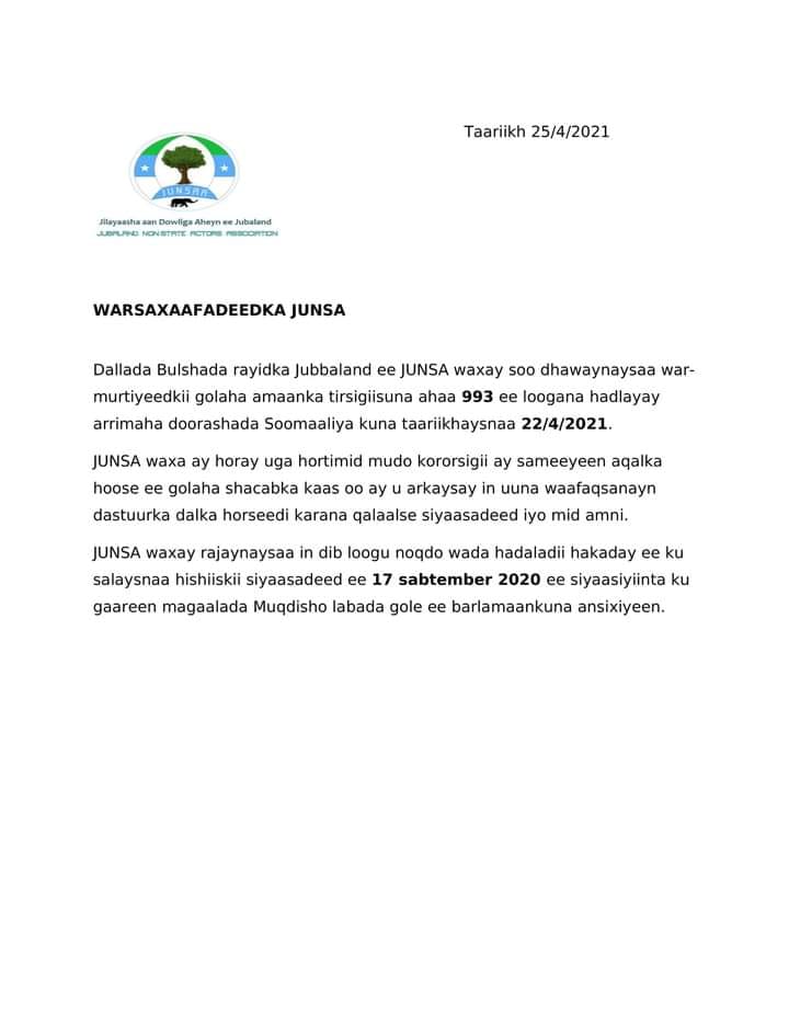Dallada Bulshada rayidka Jubbaland ee JUNSA ayaa soo dhawaysay war-murtiyeedkii golaha Ammaanka, kaas oo looga soo horjeedo muddo-kordhinta xubno kamid ah Golaha Shacabka Baarlamaanka muddo xileedkiisu dhamaaday ay u sameeyeen Hay’adaha Dowladda uu hoggaamiyo Farmaajo.