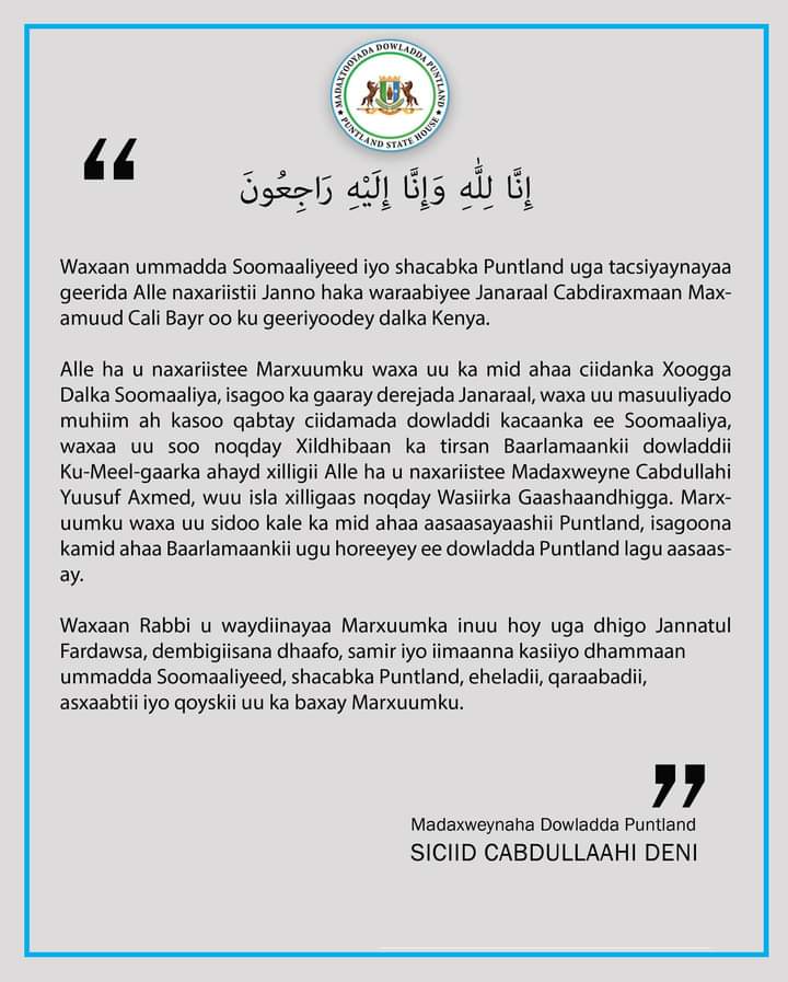 Share Facebook Twitter LinkedIn Pinterest Email Copy Link Madaxweynaha Dowladda Puntland Mudane Siciid Cabdullaahi Deni oo ka tacsiyeeyey geerida Alle ha u naxariistee Marxuum Janaraal Cabdiraxmaan Maxamuud Cali Bayr.