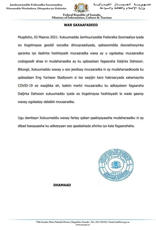 Xukuumadda ayaa sheegtay in Musharixiintu ay ku gacan seyreen dalabkoodaas, iyadoo ugu baaqday in Dadka banaan-baxa ka qeybgalaya ay raacaan tallooyinka Caafimaadka ee ka hortaga cudurka COVID-19.