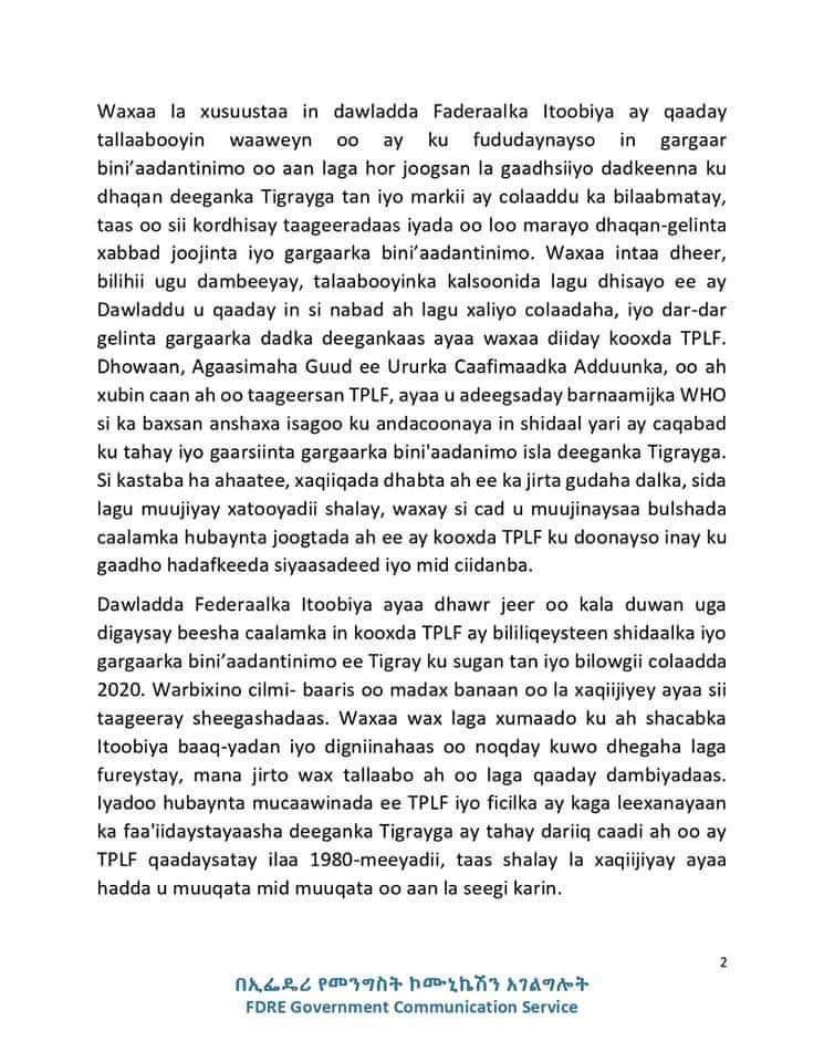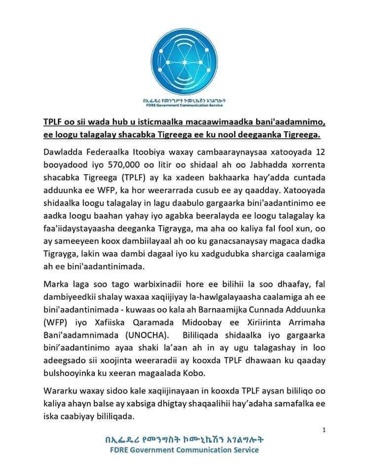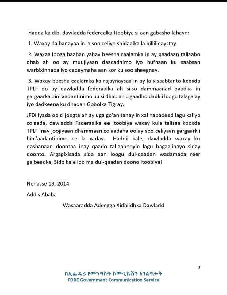 Home»Somalia»Dowlada Fadaraalka Itoobiya oo ku Eedaysay Tigreegu in ay bililiqaysteen Shidaal