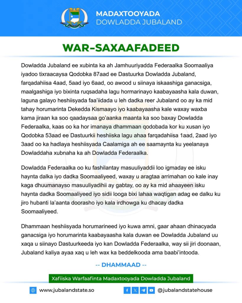 Dhammaan heshiisyada horumarineed iyo kuwa amni, gaar ahaan dhinacyada ganacsiga iyo horumarinta kaabayaasha kala duwan ee Dowladda Jubaland uu xaqa u siinayo Dastuurkeeda iyo kan Dowladda Federaalka, way sii jiri doonaan, Jubaland kaliya ayaa xaq u leh wax ka beddelkooda ama baabi’intooda.”