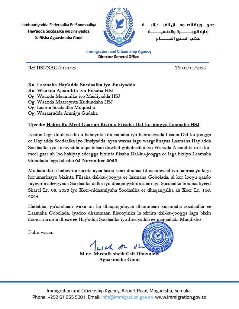 E-visa-ha Dal ku jooga si rasmi ah,ayaa loo joojiyay ugu danbayn.