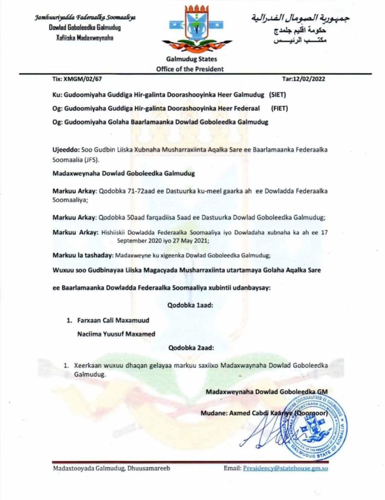 Share Facebook Twitter LinkedIn Pinterest Email Copy Link Madaxweynaha Dowladda Galmudug, Axmed Cabdi Kaariye , ayaa soo saaray liiska Musharixiinta u tartamaya Golaha Aqalka Sare ee Baarlamaanka dowladda Federaalka Soomaaliya Xubintii u danbeysay. Halkan ka akhriso:-