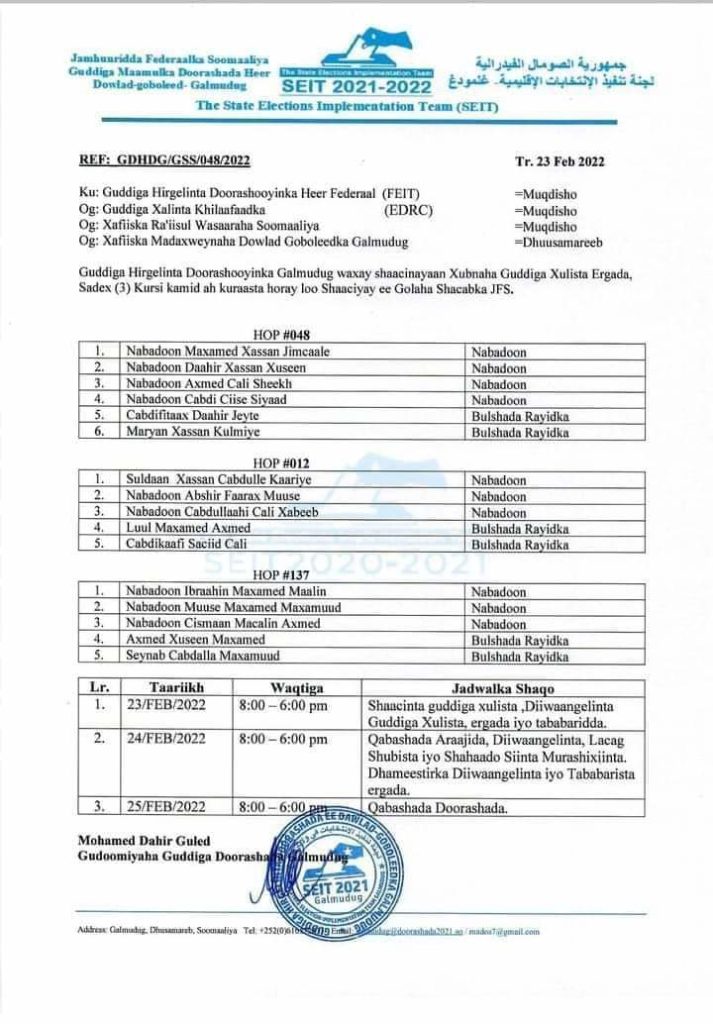 Share Facebook Twitter LinkedIn Pinterest Email Copy Link Guddiga Maamulka Doorashada Heer Dowlad Goboleed ee Galmudug,ayaa shaaciyey Guddiga Odayaasha iyo Bulshada Rayidka ah ee soo xulaya ergada 3-Kursi oo ka mid ah kuwii dhawaan la shaaciyey. Halkan ka akhriso:-