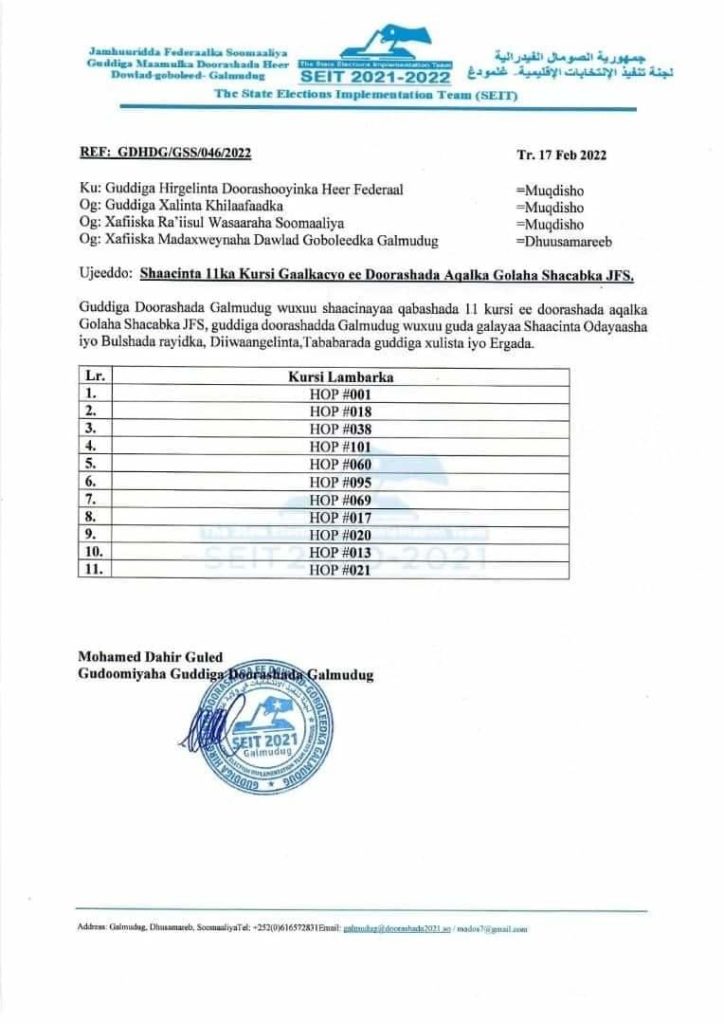Share Facebook Twitter LinkedIn Pinterest Email Copy Link Gudiga Doorashada Dowlad Goboleedka Galmudug,ayaa shaaciyay 11-kursi oo ka mid ah kuraasta Golaha shacabka ee lagu dooran doono Gaalkacyo oo ah Magaalada Labaad ee Deegaan doorashada Dawlad Gobaleedka Galmudug. Halkan ka akhriso:-