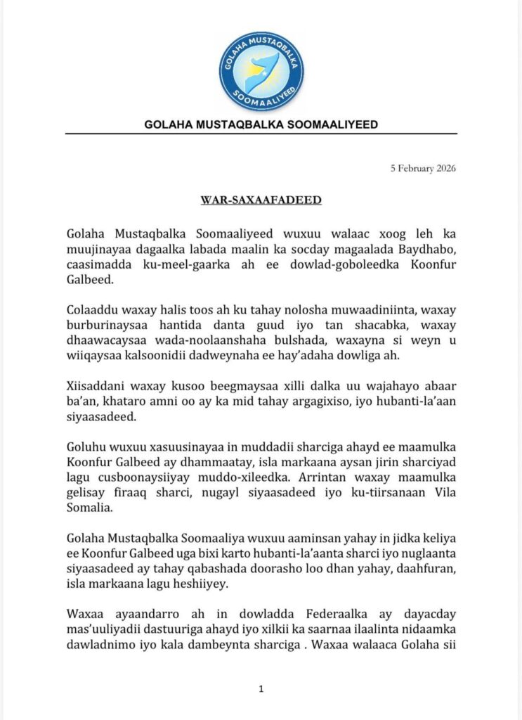 Share Facebook Twitter LinkedIn Pinterest Email Copy Link Golaha Mustaqbalka Soomaaliyeed oo war kasoo saaray dagaalkii ka dhacay magaalada Baydhabo. Halkan ka akhriso:-