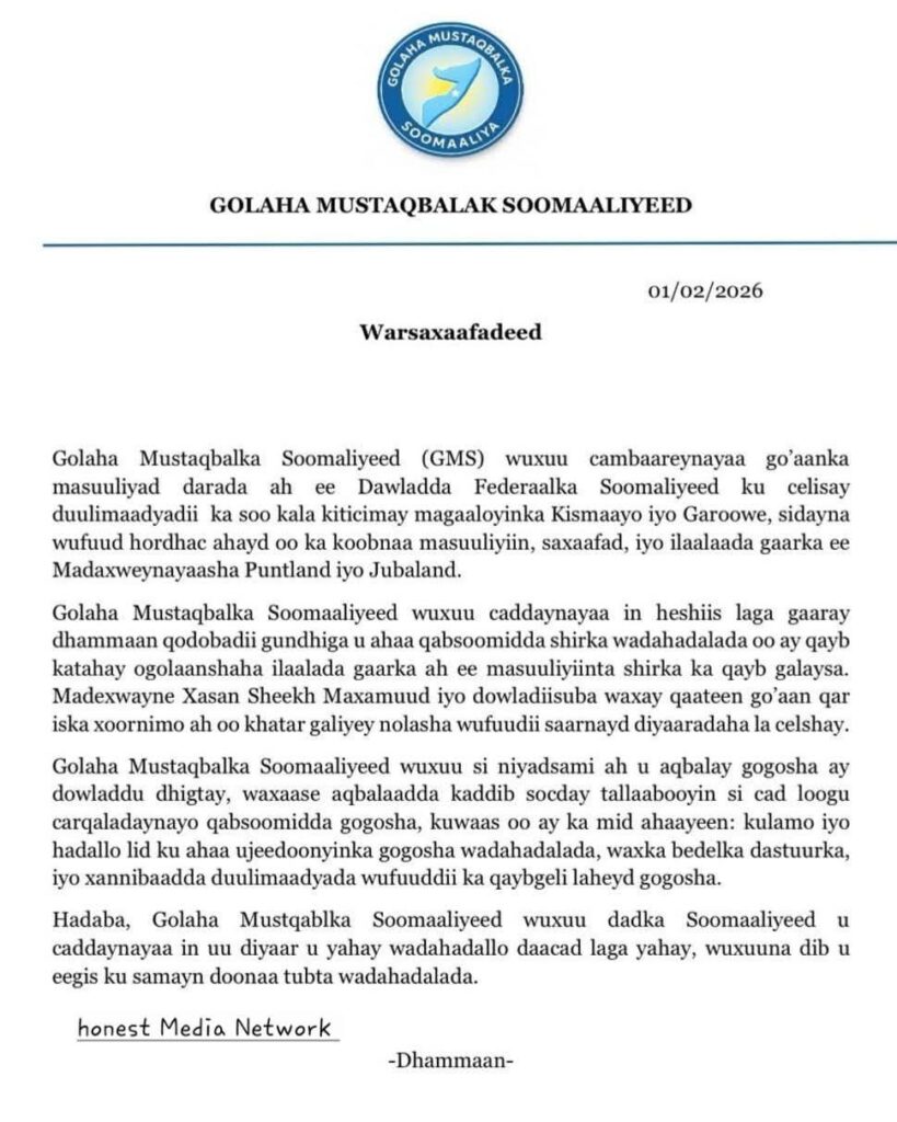 Golalaha Mustaqbalka Somaliyed,ayaa sheegay warsaxaafadeed uu kasoo saaray Ciidamada ilaalada Madaxweynayaasha PL & JL,waxaana lagu yiri war saxaafadeedka..