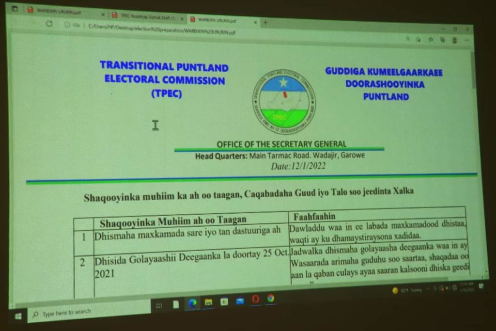 Guddiga KMG Doorashooyinka Puntland ee TPEC ayaa maanta kulan la yeeshay Ururada siyaasadda Puntland, kulankan oo ka danbeeyay laba kulan oo horey uyeesheen labada dhinac ayaa TPEC Ururadda ugu soo bandhigeen fikradihii ururadu kusoo gudbiyeen labadii kulan ee hore iyo qaybtii Guddigu ku dareen sidoo kale waxaa kulanka lagu falaqeeyey qorshaha hirgalinta dooorashad degmoyinka dhiman.