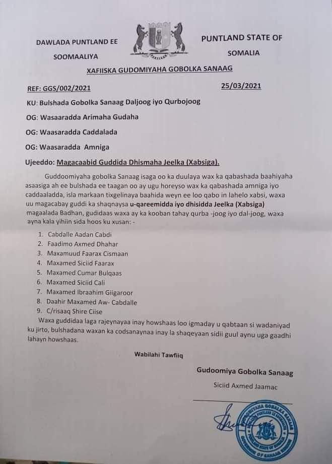 Guddoomiyaha Gobalka Sanaag oo Guddi cusub magacaabay (Akhriso)