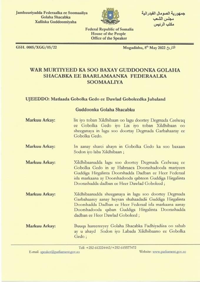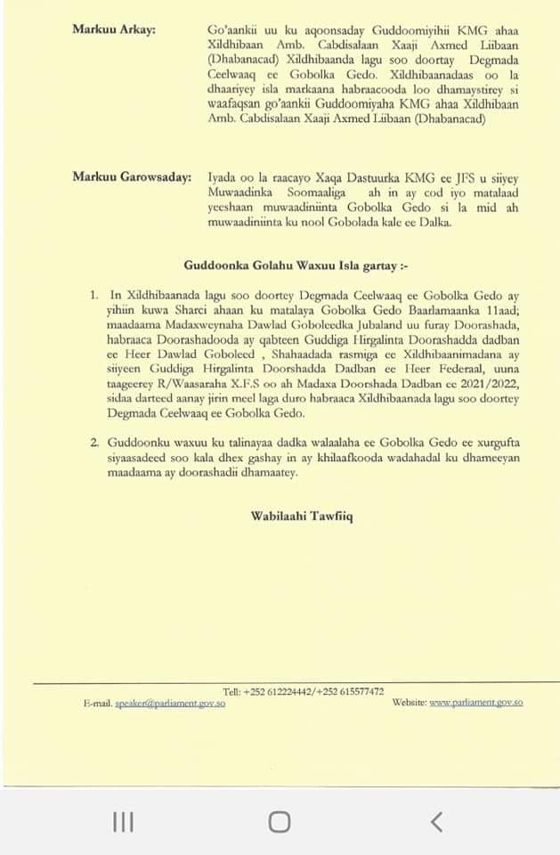 Home»Somalia»GUDDOONKA GOLAHA SHACABKA BAARLAMAANKA FEDERAALKA OO AQOONSADAY XILDHIBAANADA CEEL-WAAQ