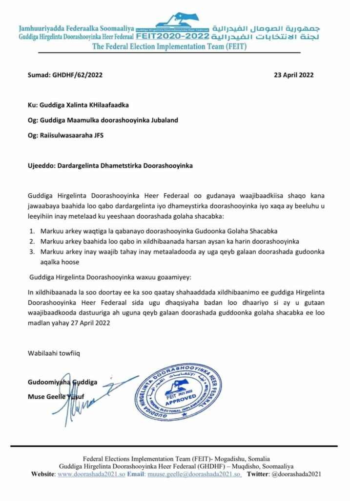 Guddiga Doorashooyinka ee Heer Federal oo ku baaqay in la dhaariyo Xildhibaannada Golaha Shacabka BJFS ee soo qaatay shahaadada musharaxnimo, si ay uga qeyb qaataan doorashada Guddoonka Golaha Shacabka BFS oo lagu wado in ay dhacdo 27 April 2022.