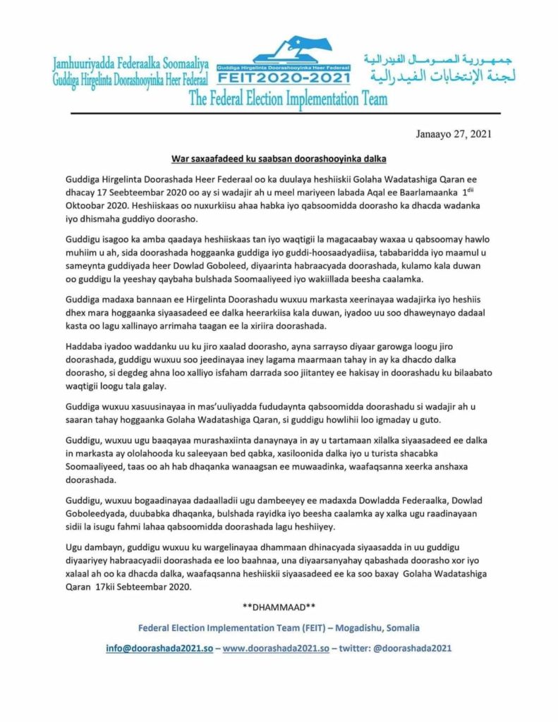 Share Facebook Twitter LinkedIn Pinterest Email Copy Link Gudiga Hirgalinta Doorashooyinka Heer Federaal Ee Lagu muransan yahay Ayaa Warsaxaafadeed kasoo Saaray Khilaafka Kataagan Doorashooyinka Dalka. Halkan ka akhriso..