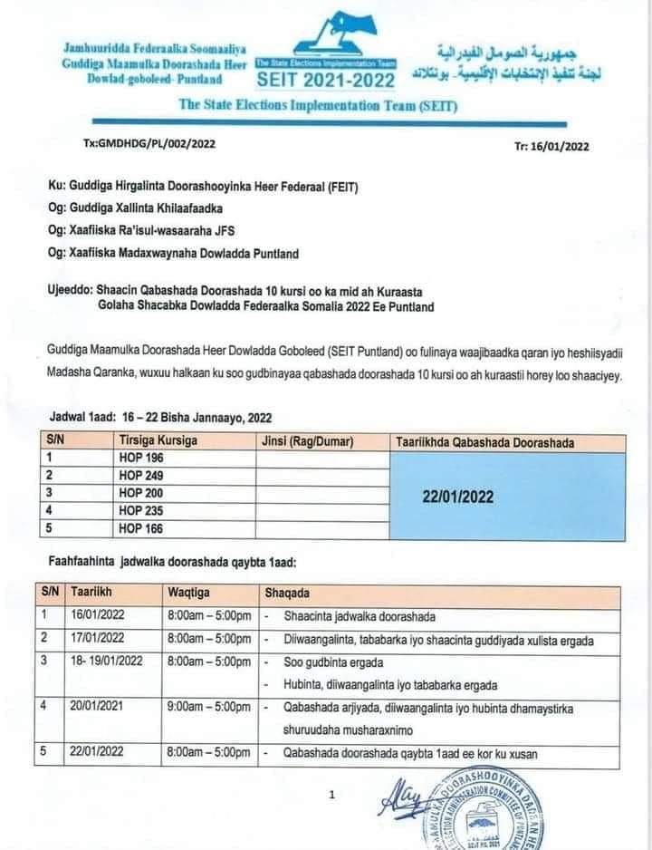 Puntland,ayaa maanta ku dhawaaqday qabashada doorashada 10-ka mid ah Kuraasta Golaha Shacabka 10-ka maalmood ee soo socda.