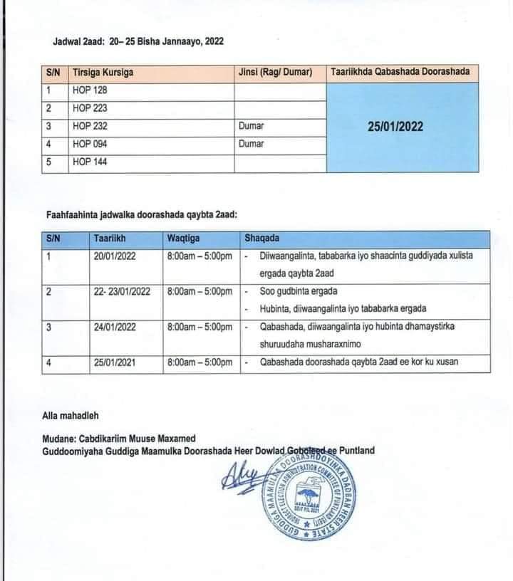 Guddiga doorashada heer dowlad goboleed ee Puntland ayaa sheegay in shan ka mid ah kuraasta doorashadooda la qaban doono 22-ka Janaayo 2022, halka shan kale la qaban doono 25-ka Janaayo. Waa kuraastii ugu horreysay ee Golaha Shacabka ee baarlamanka 11-aad oo doorashadooda lagu qabanayo Puntland.