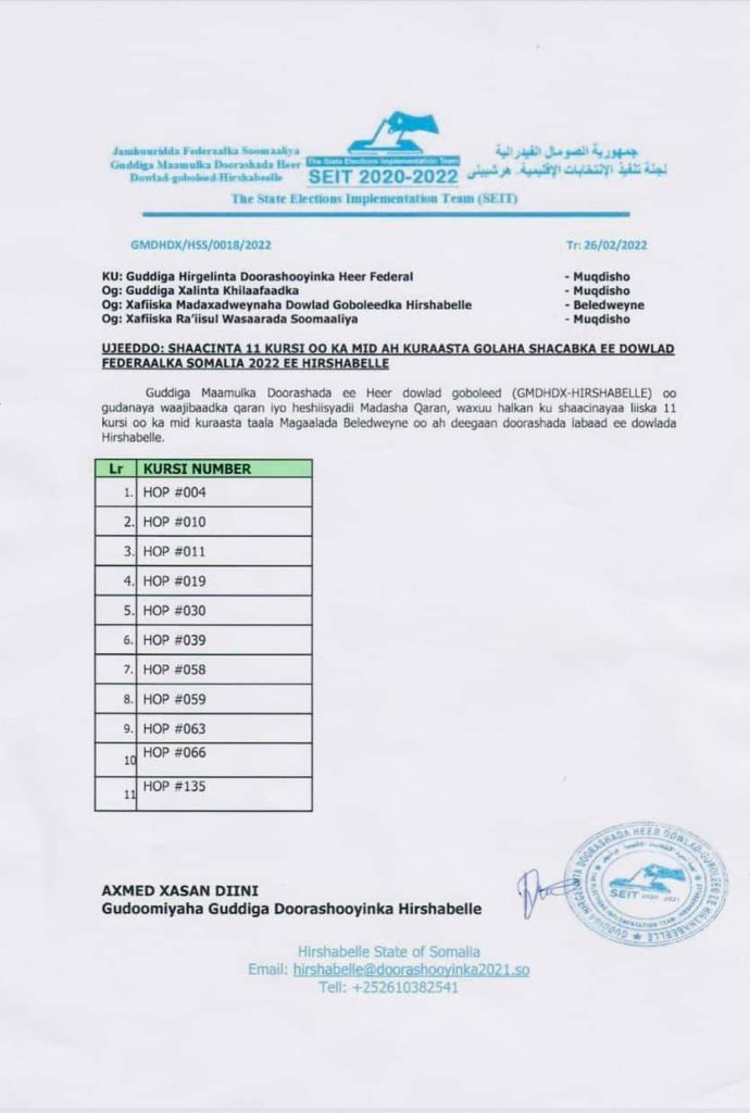 Guddiga Maamulka Doorashada Hirshabelle,ayaa shaaciyey 11-kursi oo ka mid ah kuraasta Golaha Shacabka ee Deegaan doorashadoodu tahay Hirshabeelle. Hoos ka akhriso.
