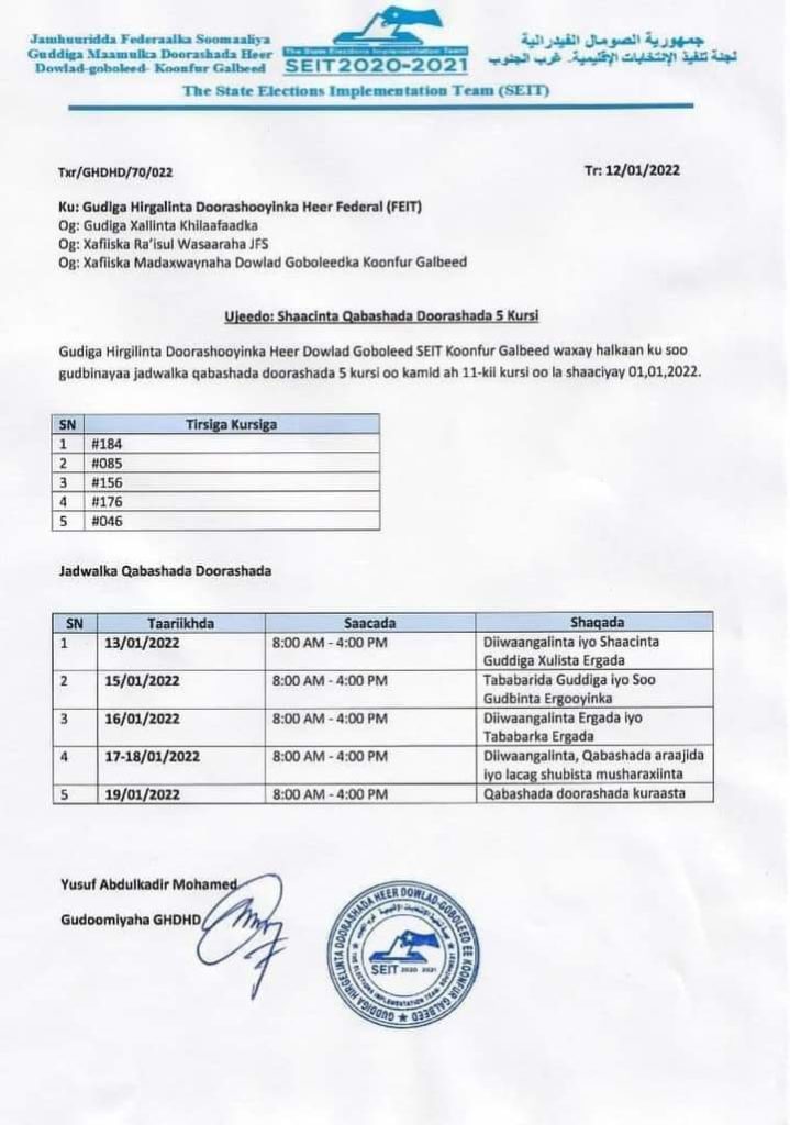 Share Facebook Twitter LinkedIn Pinterest Email Copy Link Guddiga Hirgalinta doorashooyinka heer Koonfur Galbeed oo shaaciyay qabashada 5-kursi oo kamid ah kuraastii ay shaaciyeen. Halkan ka akhriso:-