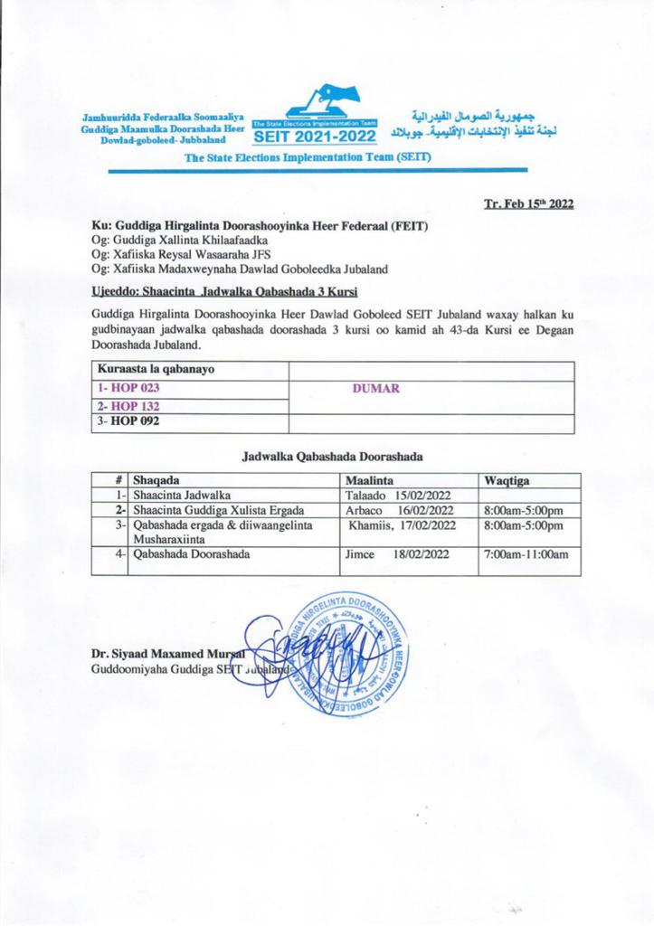 Share Facebook Twitter LinkedIn Pinterest Email Copy Link Guddiga Hirgalinta Doorashooyinka Jubbaland ayaa caawa shaaciyay saddex kamid ah kuraasta taala Magaalada Kismaayo ee caasimadda Kumeel gaarka ah ee Jubbaland. Halkan ka akhriso:-
