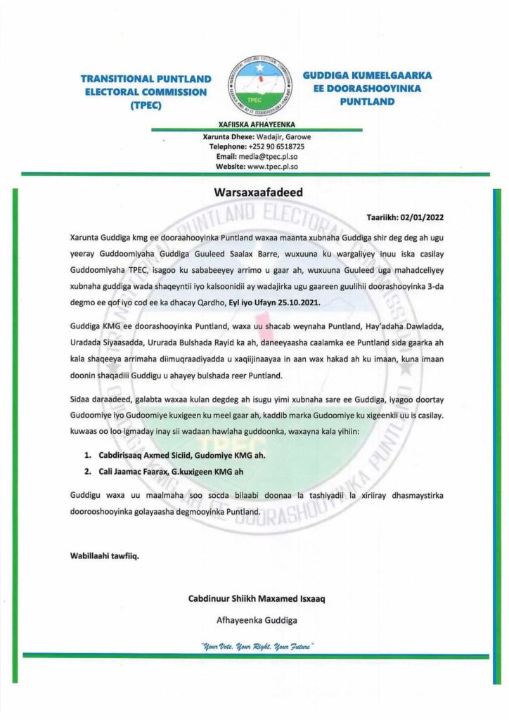 Kadib iscasilaadii Gudoomiyihii Guddiga Doorashooyinka Puntland Guuleed Saalax Barre iyo ku xigeenkiisii Jaamac Xirsi Faarax ayaa waxaa shir isugu yimi xarunta dhexe ee TPEC xubnaha sare ee Guddiga waxayna soo saareen warsaxaafadeedkan hoose.