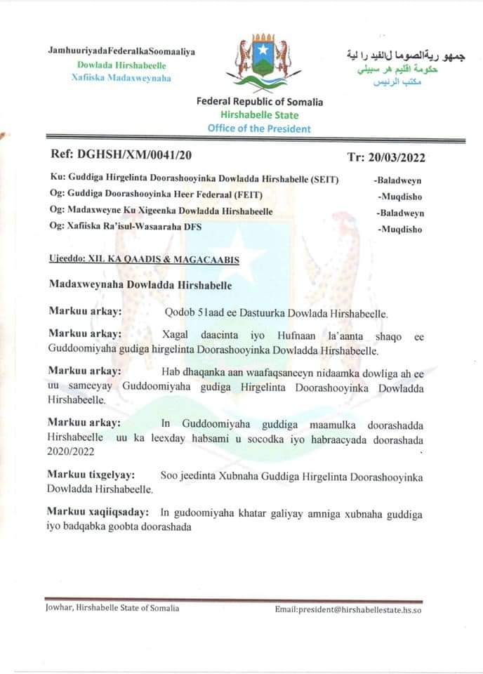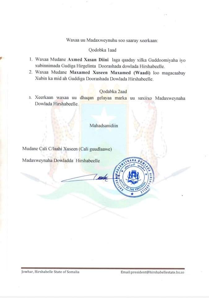 Madaxweynaha Dowladda Hirshabeelle Mudane Cali Guudlaawe Xuseyn ayaa xilkii Gudoomiyenimo iyo xubinimada Gudiga Hirgalinta Doorashada Dowladda Hirshabeelle ka qaaday Axmed Xasan Diini.