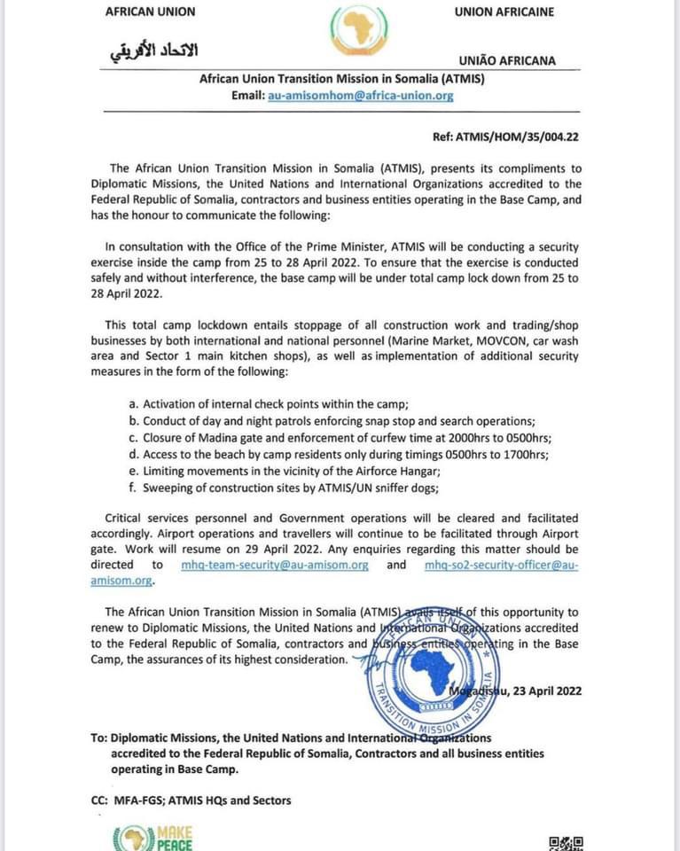 Taliska howlgalka Midowga Africa ee ATMIS qoraal uu soo saaray,waxuu ku sheegay in bandow lagu soo rogay xerada Xalane maalmaha 26-ka iyo 27-ka bishan ee ay dhacayaan doorashada Guddoonka Baarlamaanka Labadiisa Aqal.