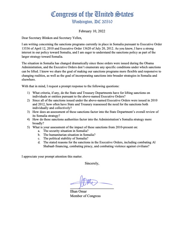 Ilhaan ayaa ka dalbatay Madaxweyne Joe Biden inuu dib u eegis ku sameeyo cunaqabateynta la saaray SoomaaliyaΒ 2010 iyo 2012-kii.