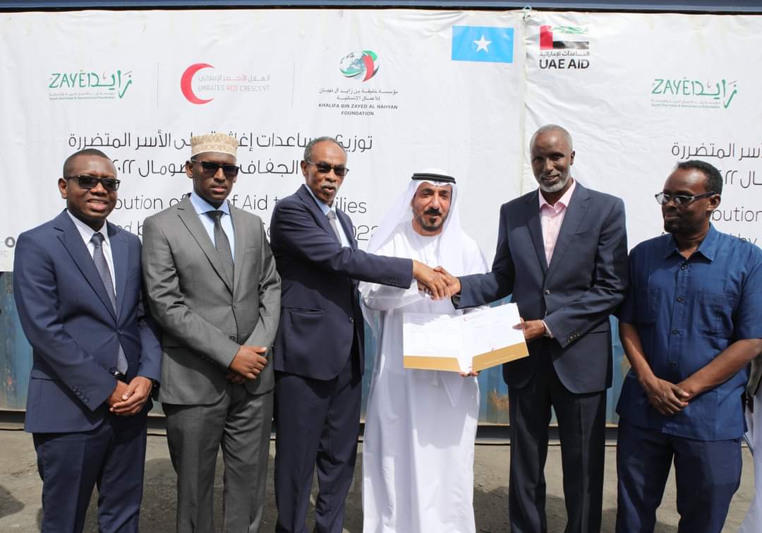 Wasiiru dowlaha xafiiska Raโiisul Wasaaraha, Mudane Xirsi Jaamac Gaani, oo uu wehliyo Wasiirka Wasaaradda Dekedaha, Gen. Cabdullaahi Axmed Jaamac (Ilkajiir), Xoghayaha Joogtada ee Xafiiska Raโiisul Wasaaraha, Maxamed Abuukar Zubeyr iyo masuuliyiin kale ayaa la wareegay deeq raashin oo ka timid dalka aan walaalaha nahay ee Imaaraadka Carabta.