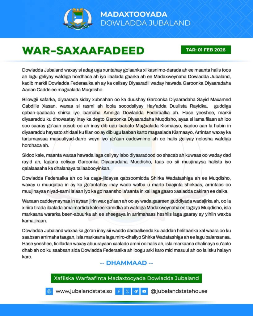 Jubaland oo ka hadashay Ciidamadeeda laga ceshay Xamar