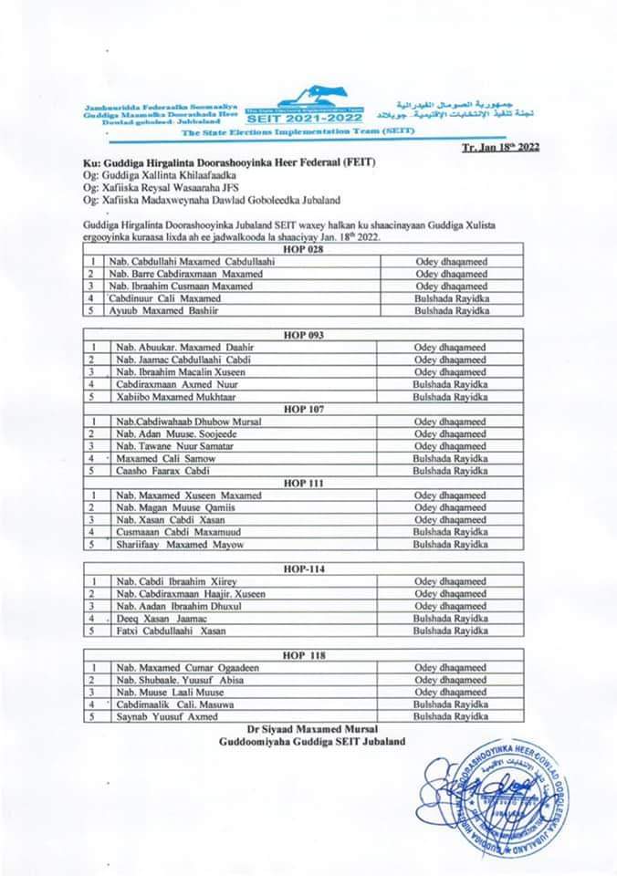 Share Facebook Twitter LinkedIn Pinterest Email Copy Link Guddiga Hirgalinta Doorashooyinka heer Dowlad Goboleed ee Jubaland SEIT waxay shaaciyeen Guddiga xulista Ergooyinka Kuraasta Lixda ah ee jadwalkooda la shaaciyey 18-Jan-2022. Halkan ka akhriso Shaacinta:-