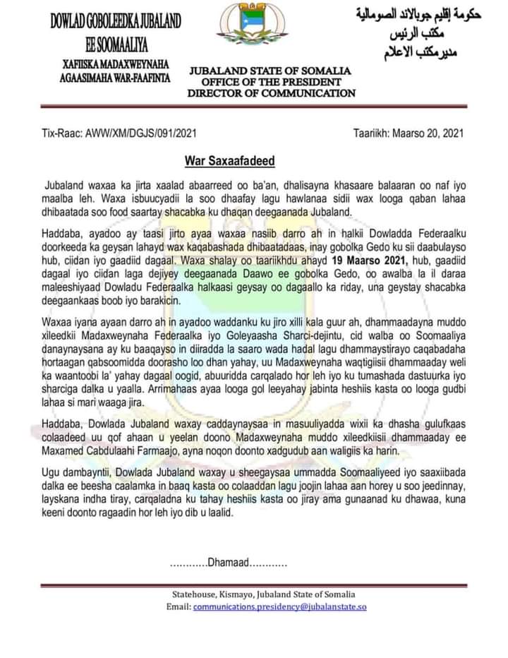 Jubbaland ayaa sheegtay in Mas’uuliyadda wixii ka dhashay colaada laga hurinayo Gobalka Gedo uu si shaqsi ah u qaadan doono Madaxweynaha muddo-xileedkiisu dhamaaday ee DFS Mohamed Abdullahi Farmaajo.