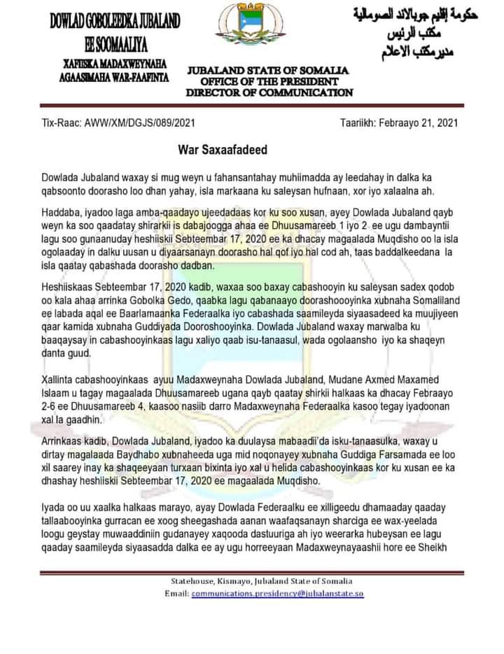 War-saxaafadeed kasoo baxay Dowladda Jubbaland ayaa looga hadlay xaalada Dalka gaar ahaan dagaaladii jimcihii ka dhacay Magaalada Muqdisho iyo Dhameystirka heshiiska Doorashada dalka.