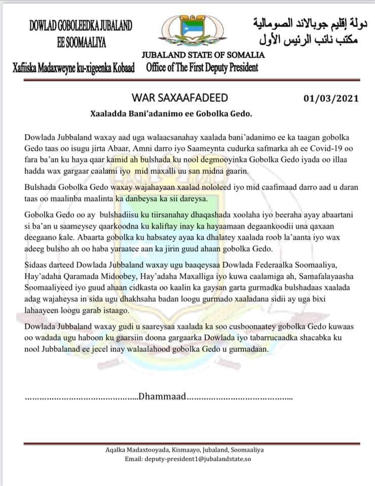 Dowlad Gobaleedka Jubbaland ayaa war ka soo saartay xaalada Abaaraha ka jira gobolka Gedo xili xaalad biniaadanimo oo adag gobolka laga soo sheegayo.