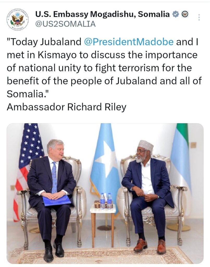 Safarka Safiirka Safaarada Maraykanka ee Somaliya uu ku tagay Kismaayo,wuxuu daarnaa Laba Qodob oo kala ahaa…..