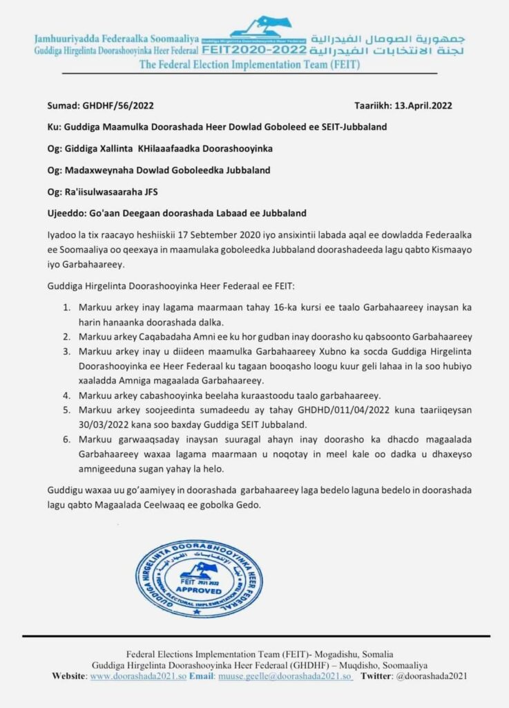 Share Facebook Twitter LinkedIn Pinterest Email Copy Link Guddiga Hirgalinta Doorashooyinka Heer Federaal ee FEIT, ayaa shaaciyay goโaanka deegaan doorashada labaad ee Jubbaland. Halkan ka akhriso:-
