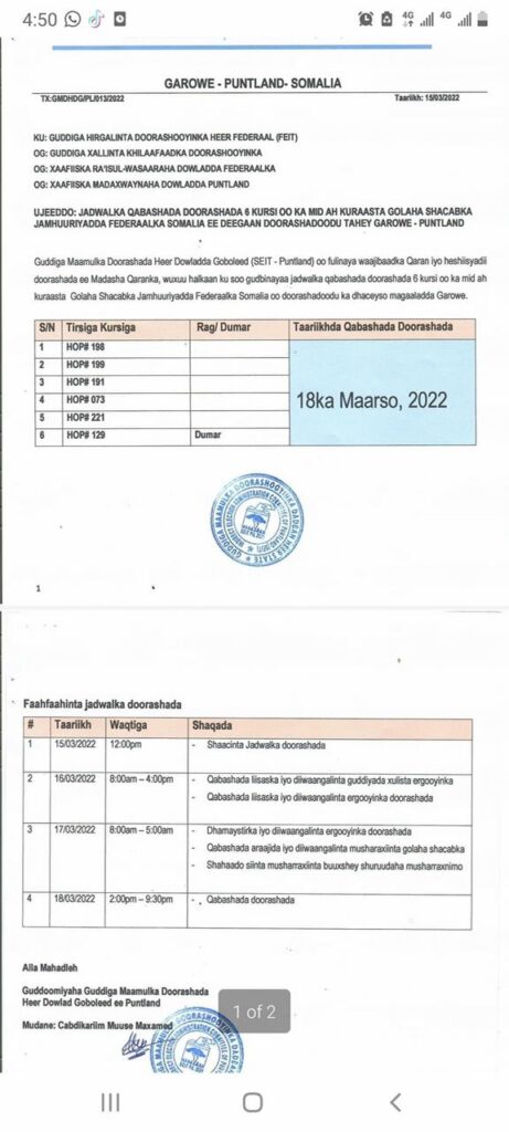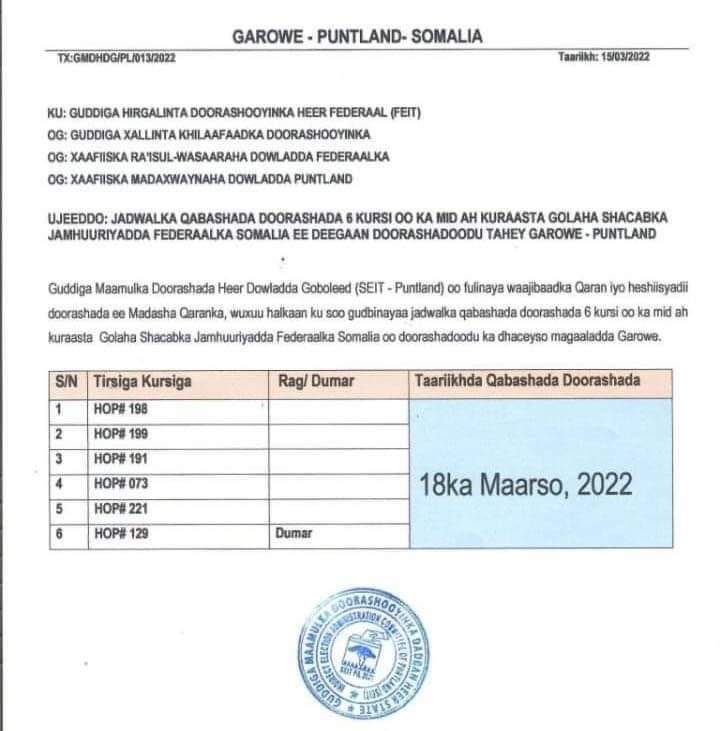 Guddiga doorashada Puntland SEIT,ayaa Maanta shaaciyey jadwalka Lixda kursi ee Gollaha shacabka oo 18-ka bishan lagu qaban doono Garowe.