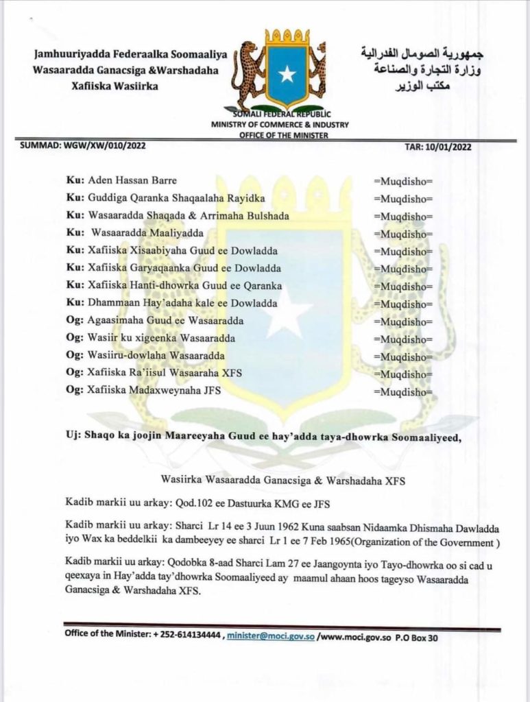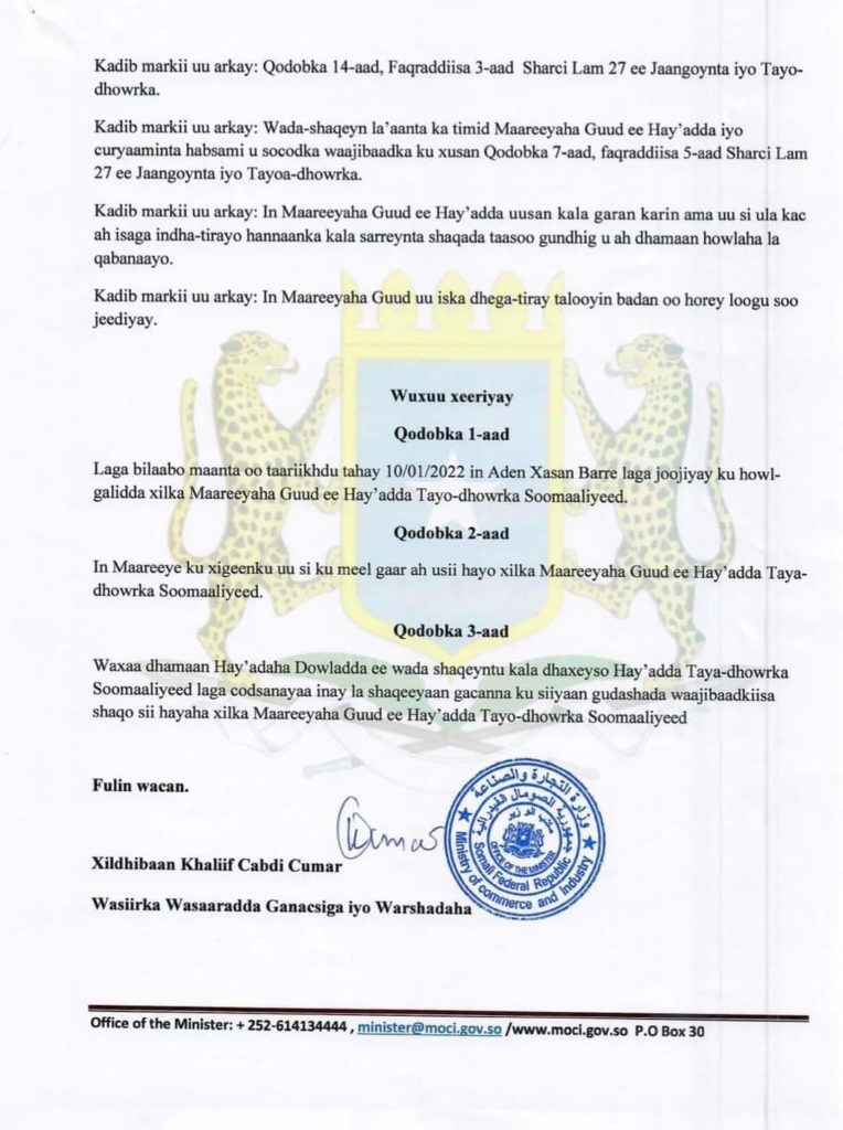 Share Facebook Twitter LinkedIn Pinterest Email Copy Link Wasiirka Ganacsiga Soomaliya ayaa shaqo joojin ku sameeyay Maareeyaha Guud ee Heyβadda Taya-dhowrka Aadan Xasan Barre, waxaana si KMG u sii heynayo xilka Maareeye Kuxigeenka Heyβadda.