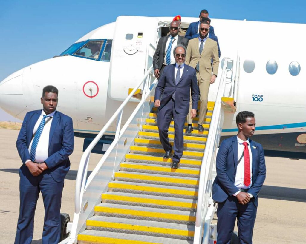 Garoowe, 25 January 2024, madaxwaynaha Dowladda Puntland Mudane Siciid Cabdullaahi Deni, ayaa Garoonka Diyaaradaha ee Garoowe kusoo dhoweeyay Madaxweynaha Jamhuuriyada Federalka ah ee Soomaaliya Mudane Xassan Shiikh Maxamuud iyo Wafdi uu hoggaaminayo oo ka qeybgalaaya Caleemasaarka Madaxweynaha iyo Madaxweyne Ku-xigeenka Dowladda Puntland 2024-2029.