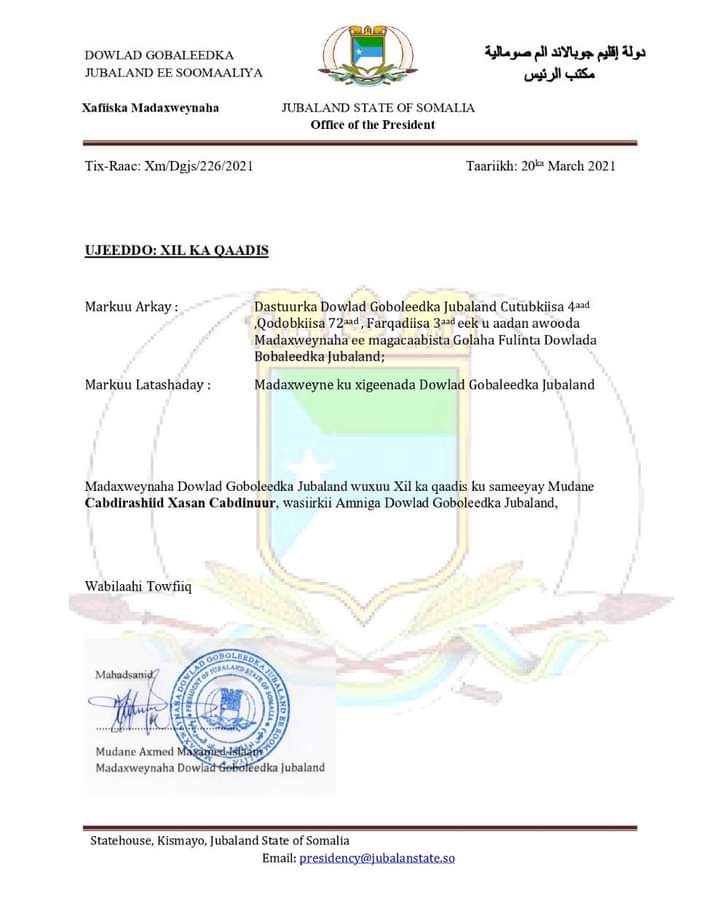 Share Facebook Twitter LinkedIn Pinterest Email Copy Link Madaxweynaha Dowlad Gobaleedka Jubbaland mudane Axmed Maxamed Islaam ayaa xilka ka qaadey Cabdirashiid Xasan Cabdinuur (Janan), Wasiirkii Amniga Dowlada Jubbaland.