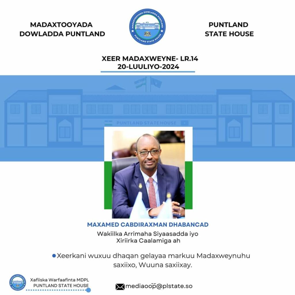 1. Waxaa Maxamed Cabdiraxmaan Dhabancad loo magacaabay Wakiilka Arrimaha Siyaasadda iyo Xiriirka Caalamiga ah ee Dowladda Punland.