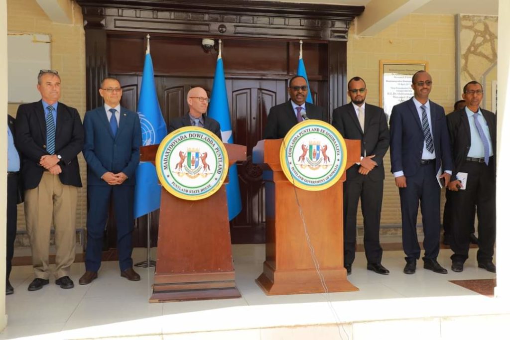 Garoowe: 25 January 2021: Madaxweynaha Dowladda Puntland Mudane Siciid Cabdullaahi Deni ayaa maanta qasriga Madaxtooyada Puntland ee Garoowe ku qaabilay, Ergayga gaarka ah ee Qaramada Midoobey u qaabilsan Soomaaliya Ambassador James Swan iyo wafdi uu hoggaaminayo oo ay ka midyihiin Madaxda Hay’addaha WFP, UNHCR iyo UNWOMEN.
