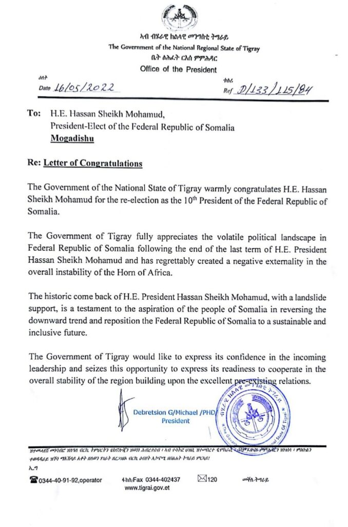 Home»Somalia»Madaxweynaha Tigreega oo hanbalyo usoo diray Madaxweyne Xasan