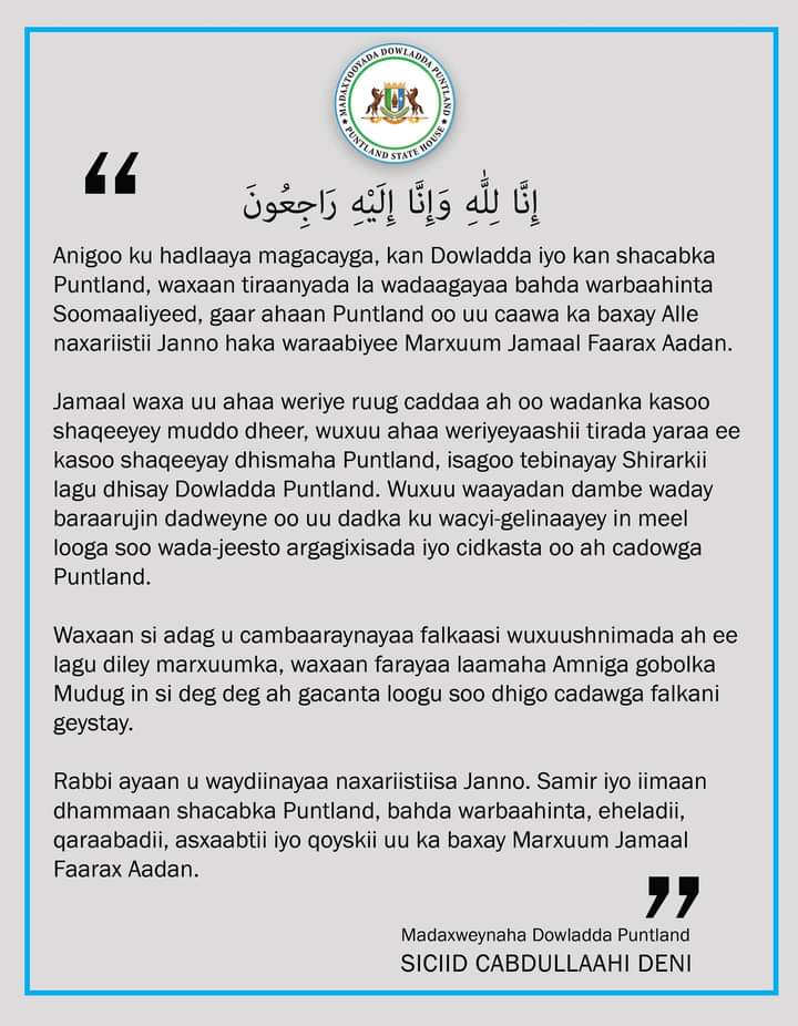 Madaxweynaha Dowladda Puntland Dr. Siciid C/llaahi Deni, ayaa ka tacsiyeeyay geerida AUN Marxuum Wariye Jamaal Faarax Aadan, oo xalay koox hubeysan ay ku dishay Magaalada Gaalkacyo ee xarunta Gobalka Mudug.