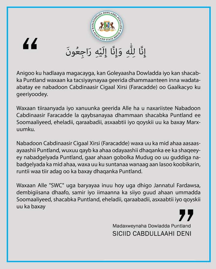 Share Facebook Twitter LinkedIn Pinterest Email Copy Link Madaxweynaha Dowladda Puntland Dr. Siciid C/llaahi Deni oo ka tacsiyeeyey geerida Alle ha u naxariistee Nabadoon Cabdinaasir Cigaal Xirsi (Faracadde).