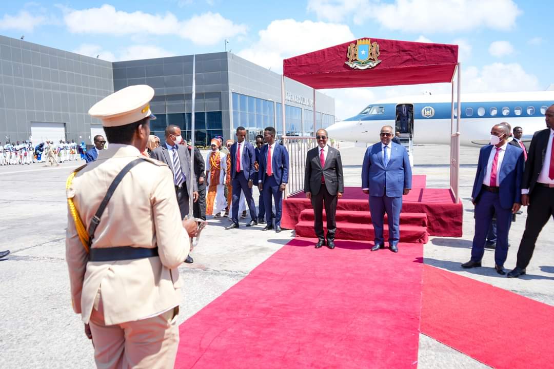 Madaxweynaha Jamhuuriyadda Federaalka Soomaaliya Mudane Xasan Sheekh Maxamuud ayaa ku soo dhaweeyey garoonka diyaaradaha Aadan Cadde ee magaalada Muqdisho, Madaxweynaha dalka aan walaalaha nahay ee Jabuuti Mudane Ismaaciil Cumar Geelle iyo wafdi uu hoggaaminayo oo maanta soo gaaray dalka.