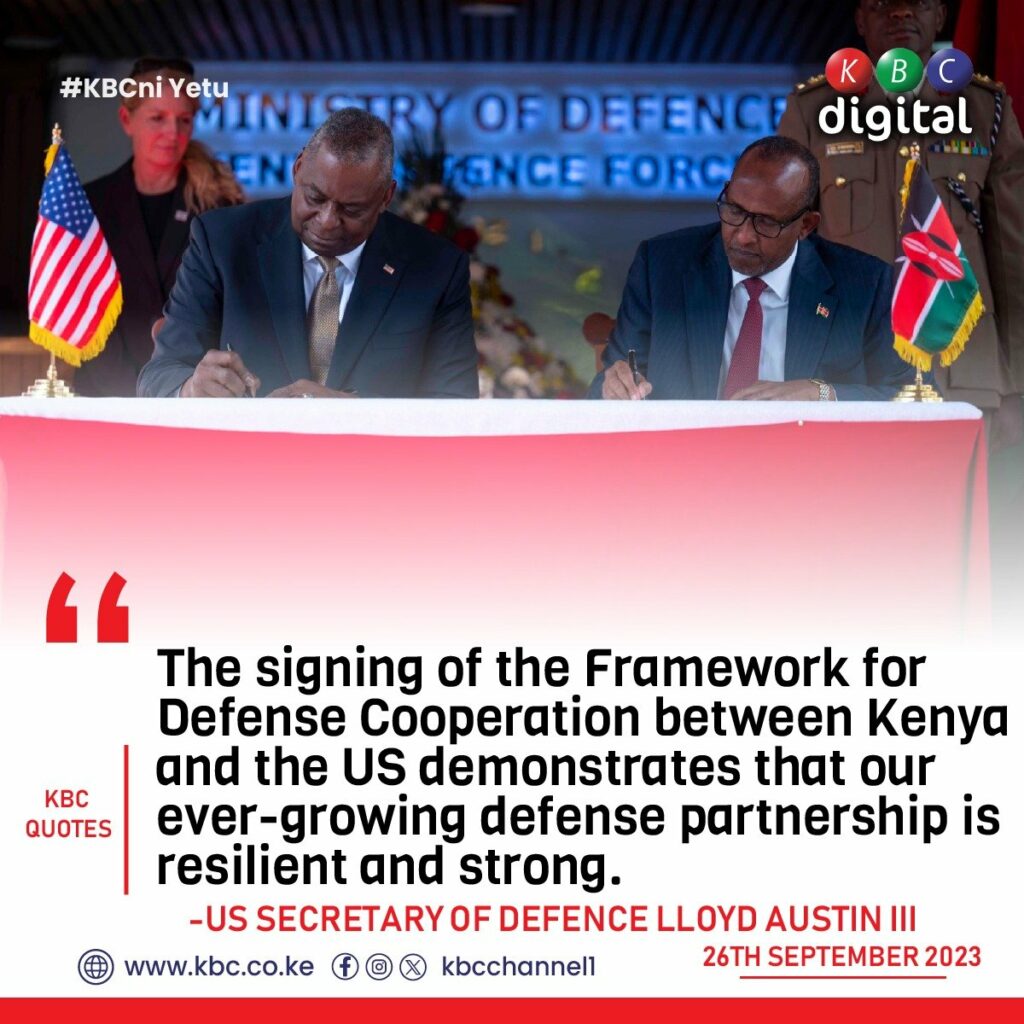 Xoghayaha Difaaca ee Dalka Maraykanka Lloyd Austin iyo Wasiirka Difaaca ee Kenya Aadan Barre Ducaale,ayaa qalinka ku duugay heshiis soconaya muddo Shan Sannadood ah.